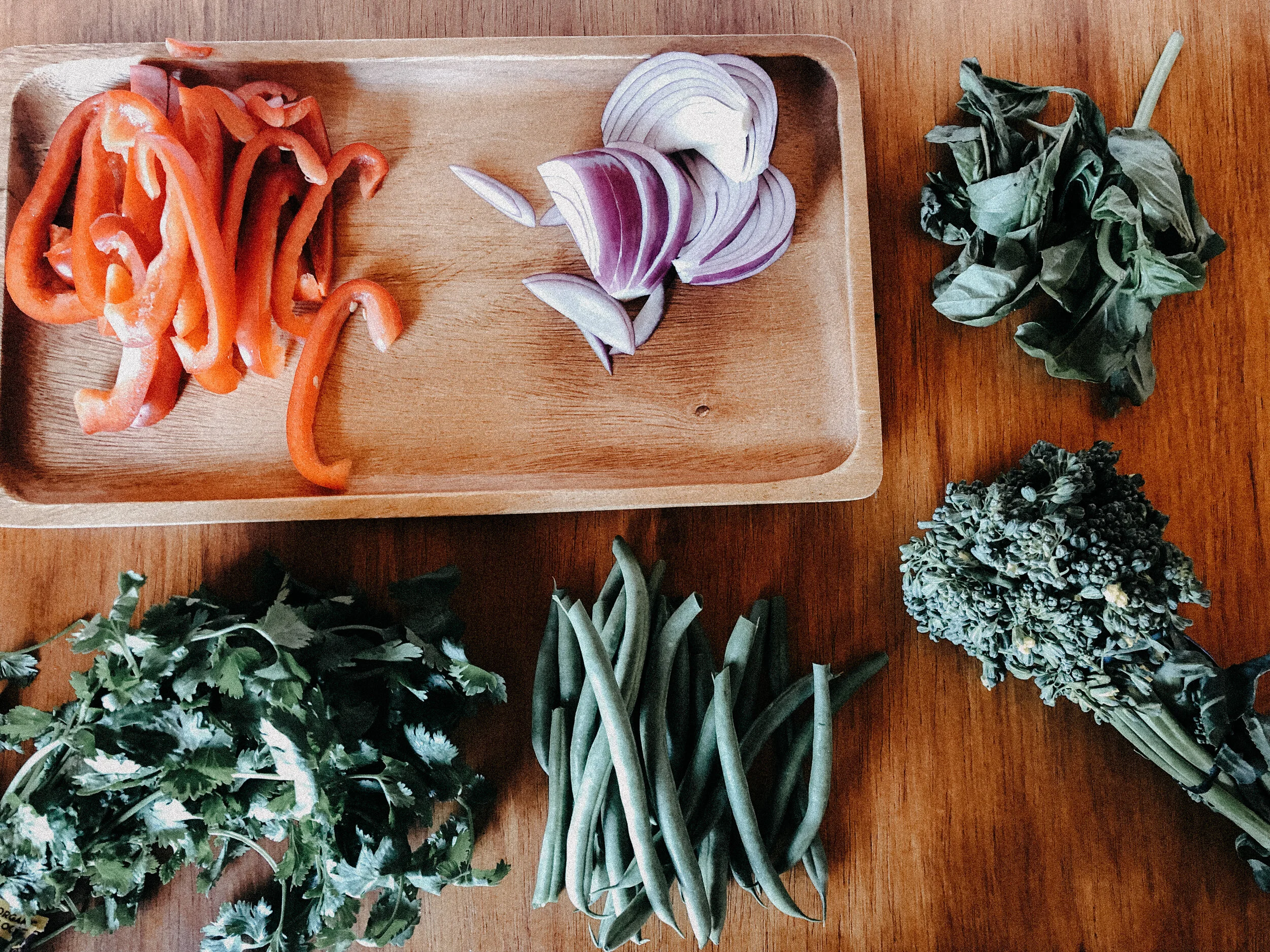 While the tofu cooks, begin prepping other veggies. Slice the carrots, red pepper, onion, broccoli / broccolini, green beans, 1 clove of minced garlic.